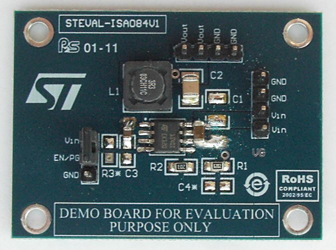 The STEVAL-ISA084V1, based on the ST1S40, is an internally compensated 800 kHz fixed-frequency PWM synchronous step-down converter demonstration board.