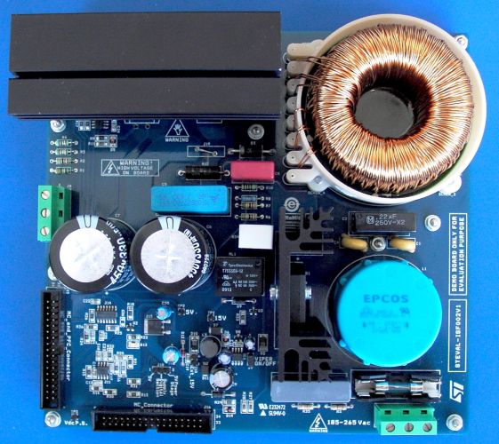 The board also demonstrates ST’s STM32F103ZE microcontroller in digital power factor corrector application. The performance of the MCU in this design is comparable to standard continuous-mode PFC dedicated monolithic ICs, while retaining sufficient microcontroller resources (such as program memory and CPU computational capability) to execute additional complex operations.