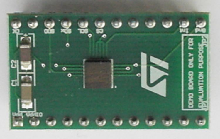 The STEVAL-MKI110V1 can be plugged into a standard DIL 24 socket. The adapter provides the complete AIS328DQ pinout and comes ready-to-use with the required decoupling capacitors on the VDD power supply line.