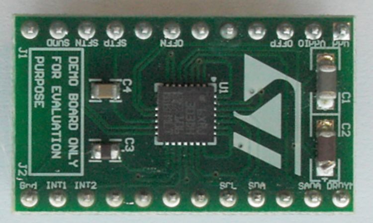 The STEVAL-MKI113V1 can be plugged into a standard DIL24 socket. The adapter provides the complete LSM303DLM pinout and comes ready-to-use with the required decoupling capacitors on the VDD power supply line.