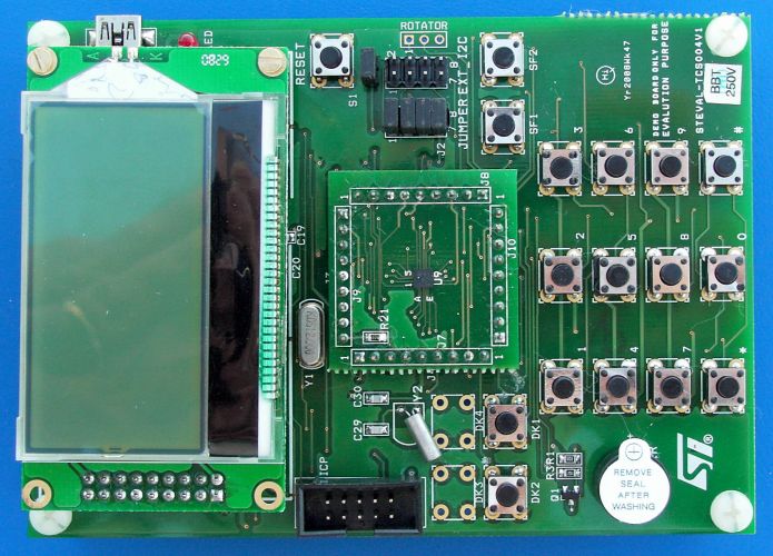 The STEVAL-TCS004V1 demonstration board is based on the STMPE1601 port expander and the ST7263BK6 microcontroller.