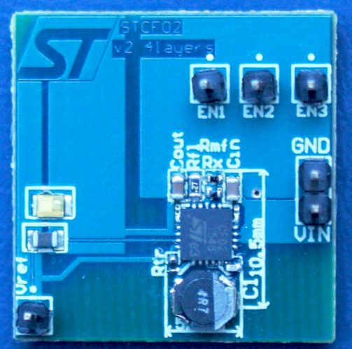 This evaluation board is dedicated to the design of a flash LED driver using the STCF02 step-up/ down current mode converter, providing the proper recommendations for PCB layout and external components. The device can operate in five modes which are selected using a combination of logic signals (connected to three enable pins). Also implemented is a simple programmable RC circuit used to shut down the device to prevent LED burning during flash mode in the event of microcontroller fault. This evaluation board drives a single flash LED with a forward voltage range of 2.7 to 5 V.