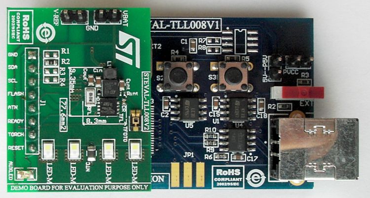 The STEVAL-TLL008V1 demonstration board is a flash LED driver using the STCF04 device, which is a buck-boost converter with an I²C interface dedicated to charging a SuperCap.