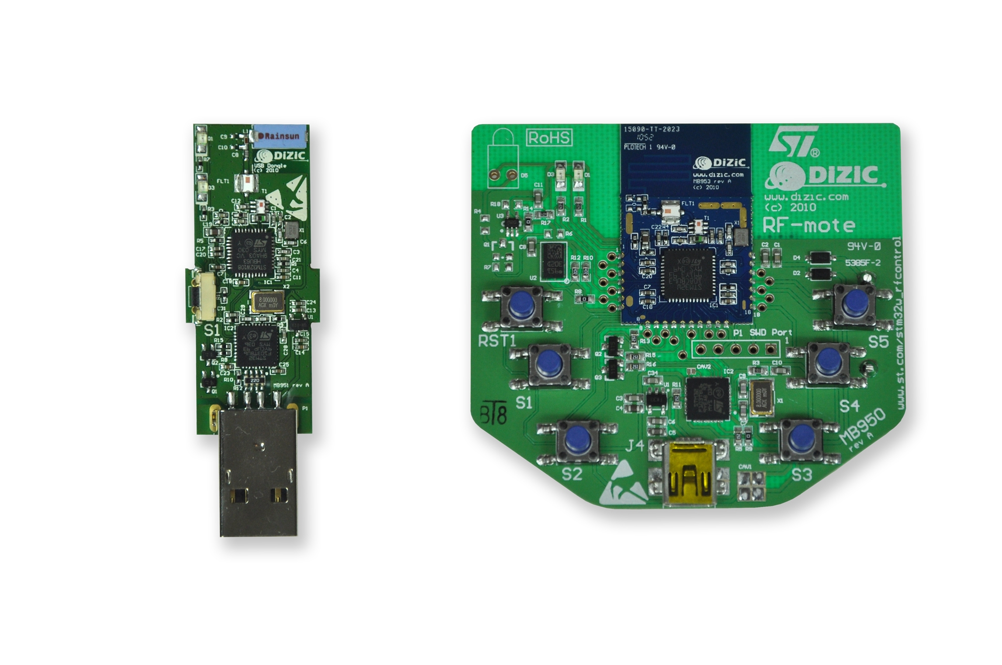 It includes everything required by beginners and experienced users to start developing RF control systems. The STM32W RF Control Kit includes one remote board and one receiver board (USB dongle), both using the STM32W microcontroller packaged in a VFQFPN48 for the remote board and VFQFPN40 for the USB dongle.