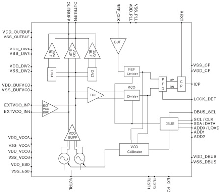 The combination of wide frequency range VCOs (using center-frequency calibration over 32 subbands) and multiple output options (direct output, divided by 2 or divided by 4) allows coverage from 750 MHz to 905 MHz and 1000MHz to 1162.5 MHz, from 1500MHz to 1810 MHz and 2000 MHz to 2325MHz, from 3000 MHz to 3620 MHz and 4000MHz to 4650 MHz bands.