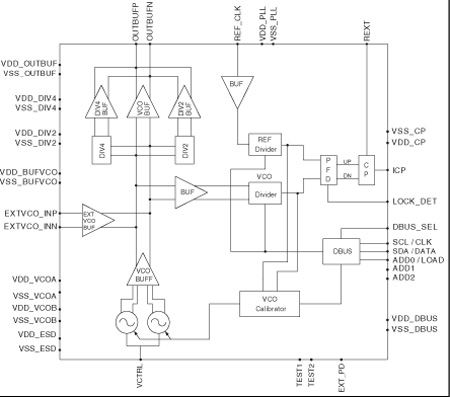 STW81103 includes an Integer-N frequency synthesizer and two fully integrated VCOs featuring low phase noise performance and a noise floor of -155dBc/Hz. The combination of wide frequency range VCOs (thanks to center frequency calibration over 32 sub-bands) and multiple output options (direct output, divided by 2 or divided by 4) allows to cover the 625MHz-762.5MHz, the 1087.5MHz-1525MHz, the 2175MHz-3050MHz and the 4350MHz-5000MHz bands.