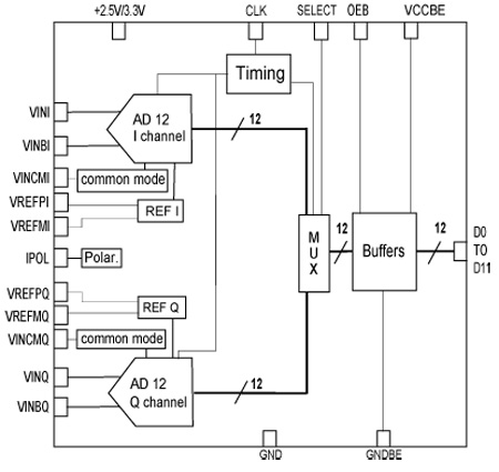 The ADC outputs are multiplexed in a common bus with a small number of pins. A tri-state capability is available for the outputs, allowing chip selection.