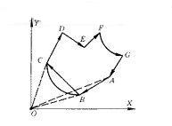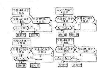 采用矢量法来判别三角形ABC的方向。为便于编程,按如下原则将矢量方向所属象限分类。设点A(xA,yA),B(xB,yB),C(xC,yc),则AB=OB-OA=(xBi+yBj)-(xAi+yAj)=(xB-xA)i-(yB-yA)j
