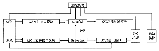 为了使以上各功能能够即时初换和同时使用,基于Windows 95,本文制作了一个软件集成系统。系统采用Visual Basic作成,进入系统后能够同时运行仿形、CAD和CAM软件。集成系统的结构图如图1所示。
