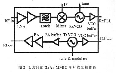 GaAsMESFET,PHEMT和HBT都是微波集成电路的理想器件,设计者根据电路性能指标和性价比选择特定工艺,如功率、低噪声、开关工艺等。不同工艺有不同的侧重点,工艺线提供的模型也不相同,很难以通用的模型表征不同工艺的特性。例如功率电路设计需要进行非线性仿真分析,为了用户能精确设计必须提供非线性的大信号模型,低噪声电路中器件工作在小信号状态且更关心噪声性能,因此需要小信号模型和噪声参数。为了降低研制成本,缩短研发周期,进行MMIC和RFIC设计时,要求器件模型既能够反映非线性电特性又能反映低频噪声、热噪声、沟道噪声等噪声特性。图2是L波段的GaAsMMIC单片收发机芯片的结构框图,整个芯片包括LNA,MIXER,PA,VCO等电路。VCO,MIXER是非线性电路,二者的设计最好用非线性模型,它们同时要分别设计相位噪声和变频噪声特性。LNA虽然是小信号电路,但在通信系统中注重IIP3,ACPR等非线性特性,而这样的指标只有非线性分析才能给出。从这个角度来看,射频系统级芯片需要更完备的器件模型以完成复杂的非线性分析和噪声特性分析。这就为模型研究人员提出三方面的问题:(1)如何充分描述器件的非线性特性,尤其是准确描述高阶非线性;(2)模型的完备性,即模型要包含更多设计人员关心的信息,如噪声特性、非常用工作区(如击穿区)特性、温度特性等:(3)器件模型参数的精确提取。器件模型的成熟和实用化还必须有商用的EDA仿真器的支持,EDA软件解读模型参数,进行器件特性的仿真计算:另外EDA-E具还应具有开放性,用户能够根据需求自建模型和对模型进行处理和完善。
