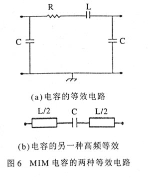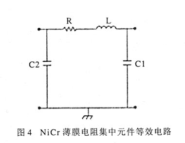 在GaAs工艺中,高精度电阻主要由NiCr薄膜淀积而成,NiCr同GaAs衬底具有很好的粘附性和很好的温度特性,阻值一般为几十欧姆/口,典型的应用范围为几欧姆到上千欧姆。薄膜电阻如图3所示。在高频下薄膜电阻并非只具有简单的阻性,也存在高频的寄生效应,尤其是阻值较大、工作频率较高时,高频效应更加显著。高频效应主要有频率色散、电介质损耗、趋肤效应等。图4是典型电阻的高频等效电路模型,等效电路的参数可以通过电磁场分析或测量参数优化后得到。