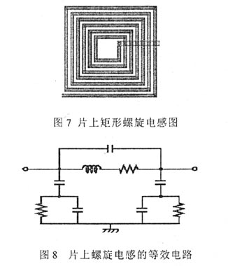 电感同电阻电容相比特性更为复杂。图7是一种矩形片上电感的版图结构,其等效电路模型如图8所示,模型中考虑了带线的阻性损耗、线圈间隙的容性寄生以及衬底损耗等因素[3]。在CMOS射频集成电路中,由于铝金属系统的损耗特别是Si衬底高频损耗,使得螺旋电感Q值很低,限制了工作频率的提高和电路性能的改善。提高9值一直是设计者追求的目标,这方面的工作很多,可参阅其他相关文献。GaAs的衬底损耗同Si相比要小得多,而且GaAs微波单片集成电路中的带线采用金系统,这也有利于电感e值的提高,即Au金属带线的本身电阻率很小; Au经过电镀加厚进一步减小阻性损耗; Au带线的电感线圈还可以采用空气桥结构,使大部分金属以桥面的形式悬浮于空气中,减小衬底损耗以及容性寄生。通常GaAs电路中电感元件可以用到Ku波段。
