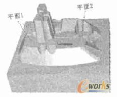 PLANAR MILL 及CAVITY MILL 是规定二轴联动的加工模块,可规划刀具平面轮廓运动及加工精度,并提供了用点、线、棱边、面进行驱动的刀具轨迹计算方式。对PLANAR MILL 而言,进行刀轨计算时只需要构成加工对象的线或棱边即可。如图1所示平面1 及平面2 就很适合用该加工模块编制其数控加工程序。应用CAVITY MILL 模块进行加工计算时,必须有表征零件三维数据的数学模型,同时还需要构造Boundary(边界) 或Blank Geome2try(毛坯体) 等要素。如图2 所示内腔的刀轨路径可用该模块进行精确规划,我们可以采取圆柱平底铣刀以自上而下的分层环绕方式去除毛坯多余材料并最终成型其内腔型面。
