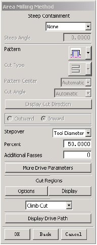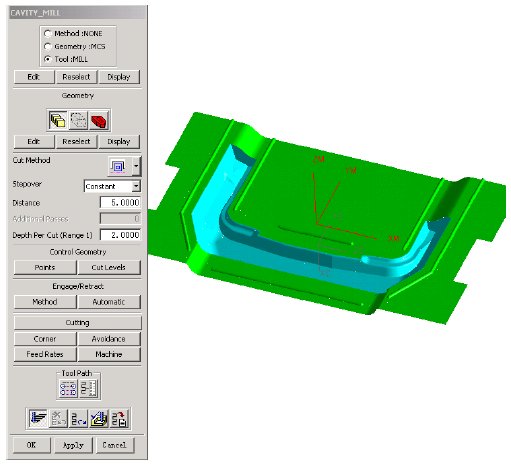 一般采用层铣的方式进行粗加工,UG提供了很多层铣切削方式如:CAVITY_MILL,ZLEVEL_FOLLOW_CAVITY,ZLEVEL_ZIGZAG等。下面以拉延模凹模(图5)的粗加工为例进行说明,如图13所示,我们采用CAVITY_MILL,其参数和方法如图示。