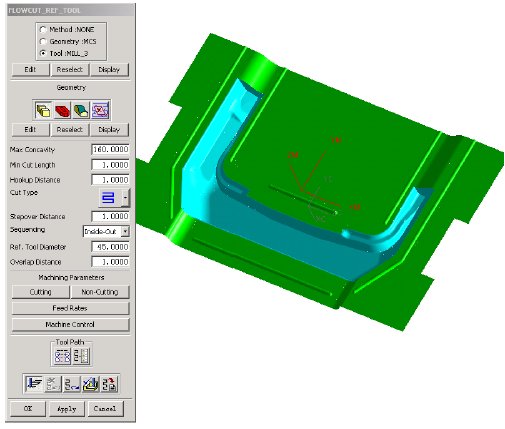 FLOWCUT_SINGLE,FLOWCUT_MULTIPLE,FLOWCUT_REF_TOOL,可以根据实际情况选择加工方式。下面以拉延模凹模(图5)的清根加工为例进行说明,如图14所示,我们采用FLOWCUT_REF_TOOL,其参数和方法如图示。