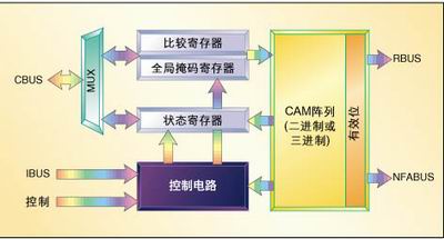 图1为典型的CAM方框图。虽然“内容可寻址存储器”指出CAM是一种存储器,但是从图1可以很明显地看出,CAM更像是逻辑器件。事实上,在CAM中的存储功能部分只占CAM不到一半的空间,其余部分由CAM阵列的支持逻辑电路部分(该部分使CAM能处理多重匹配)和提供增强功能的控制逻辑部分(配置电路)组成。