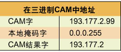 IP地址是三进制CAM最普通的数值范围。由于这些值一般落在二进制边界上,表示整个子网或一个路由集合的IP地址范围可以通过使用本地掩码在单个CAM记录内表示(位是1的被屏蔽)。例如:一个具有本地掩码0.0.0.255(1表示被屏蔽)的CAM字193.177.2.99,与子网193.177.2/24中的任何IP地址匹配。