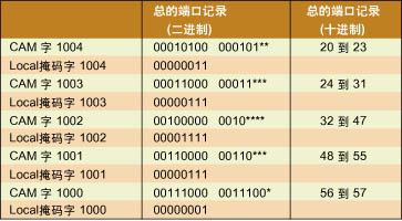 其它类型的查表范围可能未发生在二进制边界上。例如,一个用户可能想规定访问控制列表(ACL)记录,以拒绝或允许访问一个特定范围的TCP端口。这些范围可能没有发生在二进制边界,因为端口编号与该端口提供的服务类型相符。三进制CAM的通配符能力允许用户生成一个压缩形式的描述整个范围的表达式。表1显示了只用5个表格记录就表示了一个38端口范围。