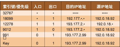 表2是一个ACL检索表的例子。索引号为991,9012和32767的表记录与输入项匹配,可是, 因为索引号991在匹配记录中具有最小的物理地址,所以被认为是具有最高优先级的匹配。