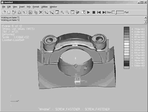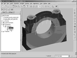 我们以螺钉紧固件的定义为例。设计者只需在两个待连接的零件上选取孔的边,然后接受缺省值即可定义螺钉的紧固件。在图6中我们可以看到模型上的相应螺栓连接,还可以看到该螺栓连接作为新连接显示在模型树中。求解此模型后,用户可以查看创建的缺省紧固件测量,它会报告螺栓剪切力和拉力,或报告结果的条纹图(如图7所示)。最后,用户将会看到螺钉紧固件如何将负荷从轴承盖传入发动机缸体。