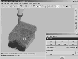 pro/engineer wildfire 野火版2.0还有许多与制造相关的新功能可以帮助用户计划生产过程。使用它,制造部门的用户可以充分利用先进的绘图功能,该功能通过移去标准工具和整体工具的线路,提供了遮挡加工仿真。pro/engineer wildfire 野火版2.0 提供了模具制造者的专用功能,它能直接输入、操作和加工stl(标准模板库)数据和新的抛光刀路轨迹,它能一次快速完成深浅不同的加工。对于有机形状,模型可与坯件模型一起载入、装配,并直接使用粗加工、重新粗加工和精加工刀具路径进行加工。在“vericut for pro/engineer”中,粗加工过程的可视化充分展示了高速加工策略和“额外层切面”计算的优点,可最大程度地降低进行额外重新粗加工的几率(如图9所示)。stl 加工还可用于工程化零件,例如电池的外壳。精加工也使用了类似此“s 形连接”连续螺旋铣削的高速加工方法。如果用户想快速生成机械加工原型,而又不想在原型最终完成之前在重新造型小平面数据上浪费时间,此功能特别有用。