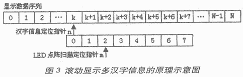 然后,依次对多汉字抽取像素信息,并按序排队存放于ROM之中,便可得到一个待显示数据序列。进一步通过寻址的方法来控制该数据序列的释放过程,就可实现在8×8 LED 发光二极管点阵上滚动显示多汉字信息的目的。图3给出的就是实现滚动显示多汉字信息的原理示意图。