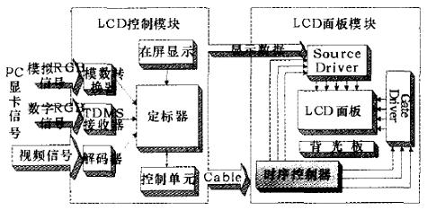 TFT-LCD系统由两个部分组成:LCD控制模块和LCD面板模块。实际应用中液晶面板又分两种,传统面板和智慧整合型面板,结构如图1所示。