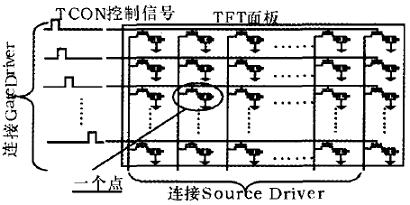 TFT-LCD工作时,首先按一定顺序将每一行Gate Driver打开,然后整排的Source Driver同时将一整行的显示电极充电到各自所需的电压,显示不同的灰阶。当这一行充好电时,Gate Driver便将电压关闭,然后下一行的Gate Driver便将电压打开,再由相同的一排Source Driver对下一行显示电极进行充放电。如此依序下去,当充好了最后一行显示电极,便又回过来从头从第一行再开始充电。