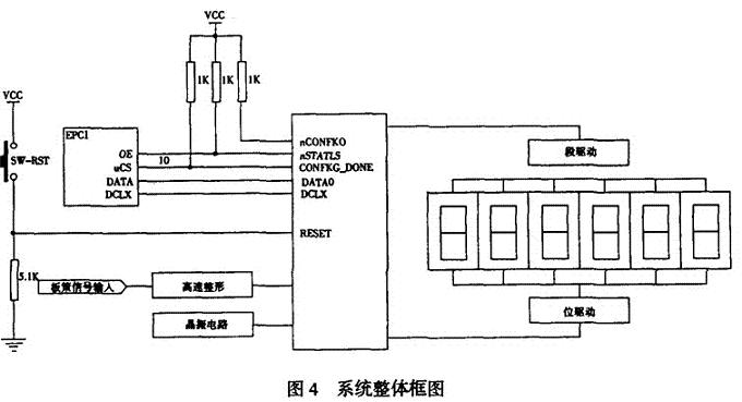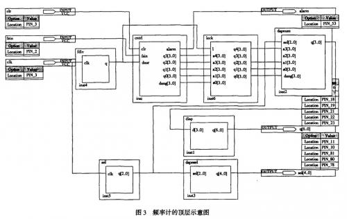 顶层示意图中的各模块用VHDL语言生成后,再生成图3所示的示意图,经编译链接之后就可以下载到系统中。再在外部扩展信号采集和相应的数码显示电路,就可以完成一个相对简单的数字频率计。图4是系统的整体框图。