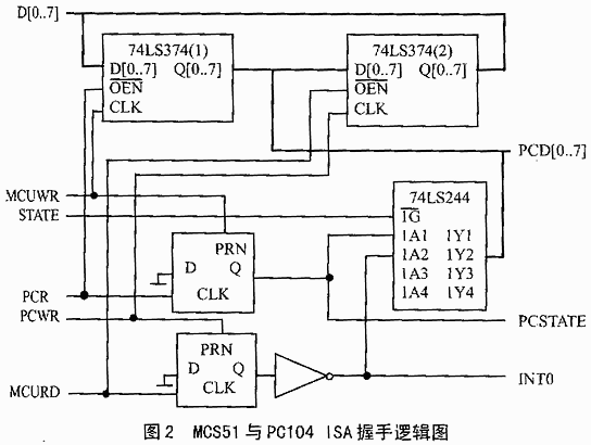 在图1单片机部分,D[0..7]是数据总线,A[0..15]是地址总线,RD和WR分别是读写信号线,INT0是单片机的外部中断。当单片机的外部中断信号有效时,单片机接收数据。