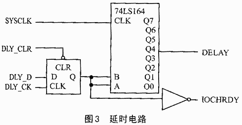 在MCS51与PC104进行通信的过程中,DLY_D信号一直有效(高电平)。在信号SYSCLK的作用下,每5个时钟周期DELAY信号有效一次,即为高电平。此时DLY_CLR信号有效(低电平),IOCHRDY信号变为高电平,PC104可以读写数据。