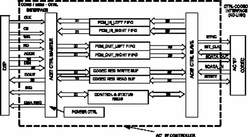 AC'97系统由音频编解码器(Codec)和音频控制器(Controller)两个部分组成。其中音频编解码器实现A/D、D/A转换、音效处理等功能,而音频控制器则是SoC内核与音频编解码器之间的数字接口,负责控制数据和音频数据的串/并、并/串转换以及传输。