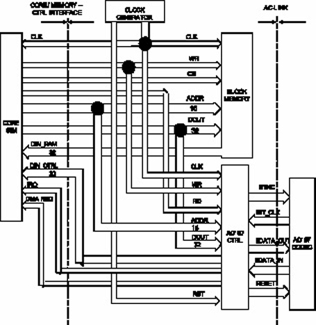 时钟发生模块(CLOCK GENERATOR)可发出27MHz、54MHz以及108MHz三种时钟,并且产生音频控制器异步复位信号RST。MicroBlaze开发电路板上的晶振发出27MHz和50MHz的占空比1:1的方波信号作为时钟发生模块的输入,调用数字锁相环硬核模块(CLOCKGEN.v和CLOCKGEN.ucf)可输出各倍频时钟(本设计用108MHz)以及异步复位信号RST。AC'97 CTRL是以RTL形式下载到Vertex II FPGA中的音频控制器逻辑。AC'97 CODEC是National Semiconductor公司的LM4549 AC'97 CODEC芯片。