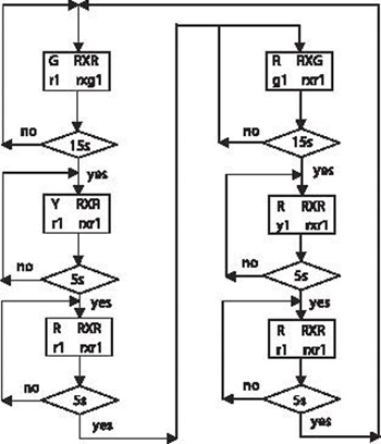 根据系统设计要求,得到控制器的ASM图,如图2所示。在这里,所有输入信号均为高电平有效。该ASM图反映了交通灯系统的不同状态的转换过程及持续时间。