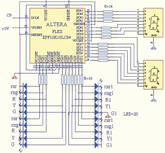 根据交通灯系统的控制要求,图3所示为本系统的硬件电路图。该电路包含了1个CPLD芯片,2个七段LED数码显示器,20个分别表示各个方向上的红、黄、绿灯,以及相应的限流电阻。这个电路与其他控制方法相比,所用器件可以说是比较简单经济的。经过实验,实现了预定的交通灯系统的控制功能。