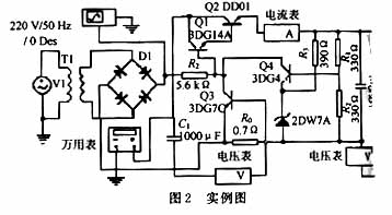理论计算V0=(R2+R1)(Vz+Vbe)/R2=13.2V,用EWB模拟仿真,使用电压表模块实测输出电压为V0=13.2 V。