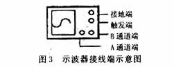 选用仪器可以从仪器库中将相应的仪器图标拖拽至电路工作区,仪器图标上有连接端用于将仪器连入电路。例如本例中使用了示波器。如图3所示,其共有4个接线端(A通道端、B通道端、触发端、接地端),需要观察测试的波形时,可以双击仪器图标打开仪器面板。