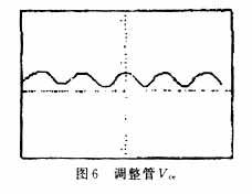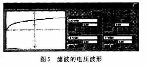 (1)整流滤波 可用EWB工作台上提供的万用表、示波器观察实际电路输出结果。如图3所示,用万用表模块测量整流滤波后的直流电压为18.8V,用示波器测得滤波波形的脉动部分如图4所示,用示波器测得滤波的电压的波形如图5所示 (2)稳压电路 可以模拟一下输出短路时,电网波动10%为242V时的情况,这在实际分析中不易做到,而用工作台来模拟非常方便。先在输出端加一负载电阻,让其阻值近似为0,如为1~10Ω,然后再模拟电网波动,只需用鼠标对准电网的电压双击,根据屏幕提示将其由220V调到242V,选用元器件库中的电流表接在图2电路中(这种电表的数量是没有限制的,存放在显示元器件库中,可供多次使用),电流表显示调整管的电流为1 A。用示波器观察调整管Vce的波形如图6所示,从中看出平均电压为5.5V。