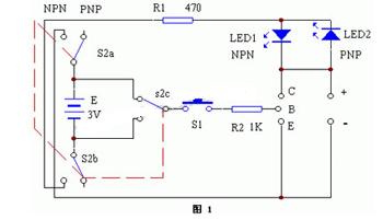 测单向可控硅时,将开关置于NPN位置,将引脚A、K、G分别连接C、E、B,按下S1放开后,LED1应仍保留在发光状态。
