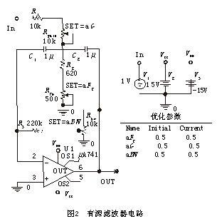 滤波器电路如图2所示。优化目标要求中心频率(Fc)为10Hz;3dB带宽(BW)为1Hz,容差为10%;增益(G)为10,容差为10%。