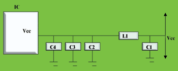 一个集成电路或放大器常常具有一个开集极(open collector)输出,因此需要一个上拉电感(pullup inductor)来提供一个高阻抗RF负载和一个低阻抗直流电源,同样的原则也适用于对这一电感的电源端进行去耦。有些芯片需要多个电源才能工作,因此可能需要两到三套电容和电感来分别对它们进行去耦处理,如果该芯片周围没有足够的空间,那么去耦效果可能不佳。