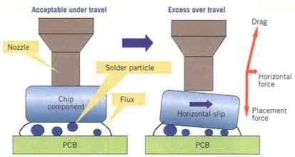 图二、当元件超程冲击焊锡颗粒时,反作用力改变吸嘴的轴向并产生一个水平的力,产生元件的偏移