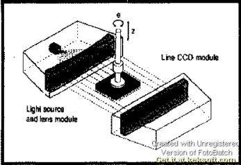 非接触"对中"系统由两个模块组成:一个模块是由光源与镜头组成的光源模块。光源采用LED发光二极管与散射透镜,光源透镜组成光源模块。另一个模块为接收模块采用Line CCD及一组光学镜头组成接收模块。此两个模块分别装在贴片头主轴的两边,与主轴及其他组件组成贴片头。三星公司CP40L/LV贴片机每台有三个贴片头,因此有相应的三套非接触"对中"系统。
