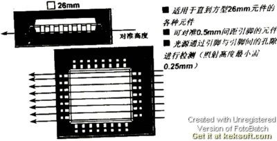 Z轴位置对准高度在第一种位置时,光束对准在QFP的壳体上(BLOCK ON BODY)(见图3上)。对准高度在第二种位置时,光束对准在QFP的引脚上(BLOCK ON LEAD)(见图3下)。对准高度在第三种位置时,光束全部对准在QFP的引脚上(细间距对准方法)(见图4),此种方法适用于细间距QFP的"对中"。