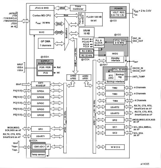 The ARM SWJ-DP Interface is embedded. and is a combined JTAG and serial wire debug port that enables either a serial wire debug or a JTAG probe to be connected to the target. The JTAG TMS and TCK pins are shared respectively with SWDIO and SWCLK and a specific sequence on the TMS pin is used to switch between JTAG-DP and SW-DP.