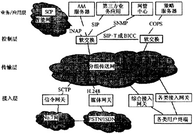 图4为基于软交换网络的VoIP应用网络,在此网络环境中有几个基本部件:软交换、中继网关、媒体网关、信令网关以及各类接入网关,还有网管服务器、策略服务器等。