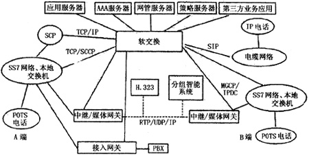 软交换技术通过SIP协议接到电缆网络上,以支持企业的IPPBX及IP电话。并通过TCP/IP协议接入SCP,也可通过TCP/SCCP协议接入到SS7网络上,使与PSTN及当前的VoIP网络无缝互连成为可能。