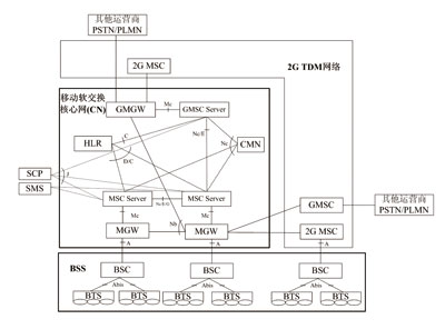 移动软交换核心网是在原GSMTDM交换网络基础上引入移动软交换设备,并重用原GSM交换网络中的HLR、SCP、SMS等网元设备,且在无线侧仍为2GBSS接入,同时和现有的TDM交换网络设备进行互通和融合。在2GTDM交换网络中引入移动软交换后,移动软交换核心网网络结构如图1所示。
