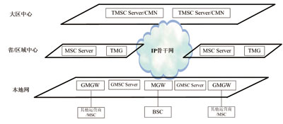 在基于IP的移动软交换网络中,网络业务部分、信令部分都由IP骨干网承载,整个网络扁平化。但根据网元设备放置的物理位置和维护界面可划分三个层面:大区中心设置TMSCServer/CMN只负责长途话务BICC信令的汇聚和转接;省中心/区域中心主要设置端局的MSCServer和长途网的TMG,分别用于控制端局的MGW和长途话务的接入;同时由于MSCServer的上移,在本地网层面主要是端局MGW、软交换关口局及BSS部分。具体如图2所示。