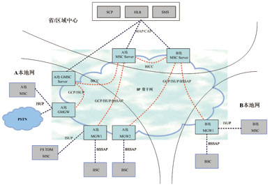 由于在现网中移动运营商的2GTDM交换网络设备大量存在,因此在实际的网络规划中应重点考虑移动软交换和原有2GTDM网络的互通和融合问题。以下将分别讨论在现有的TDM交换网络中基于IP的移动软交换网络的话务和信令组网方案。